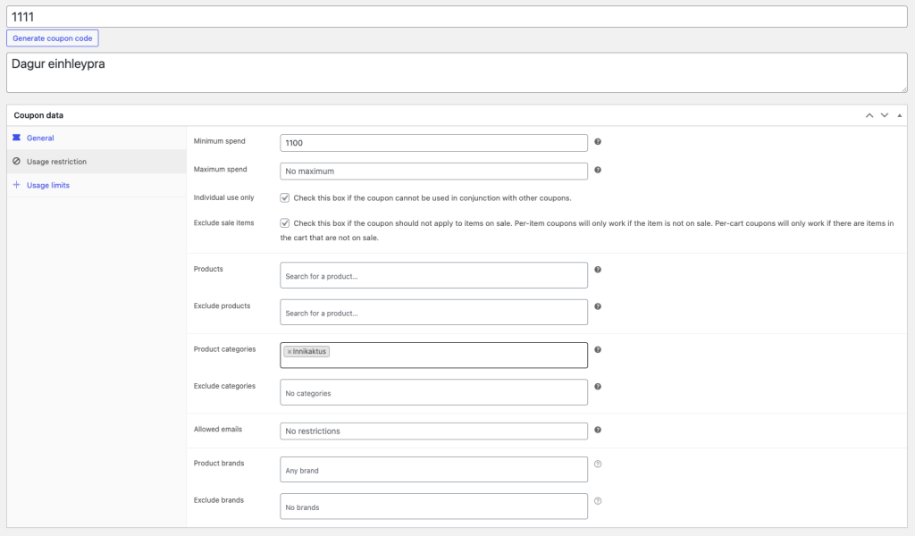 Undir Usage restriction er svo nánari stillingar, í þessu tilviki virkar afslátturinn aðeins fyrir vöruflokkinn Innikaktus og notandi þarf að kaupa fyrir að lágmarki 1.100 k.