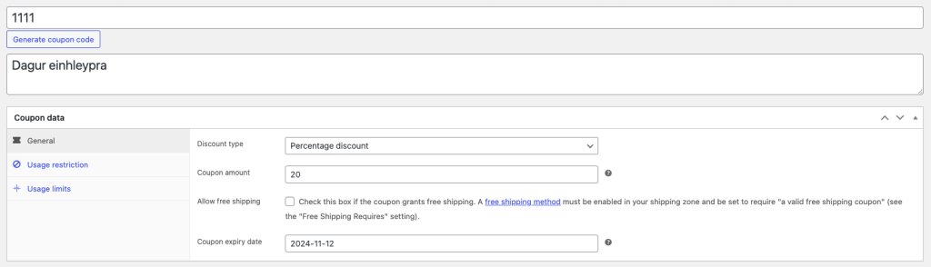 Til að bæta við Afslátt er farið í Marketing > Coupons > Add new